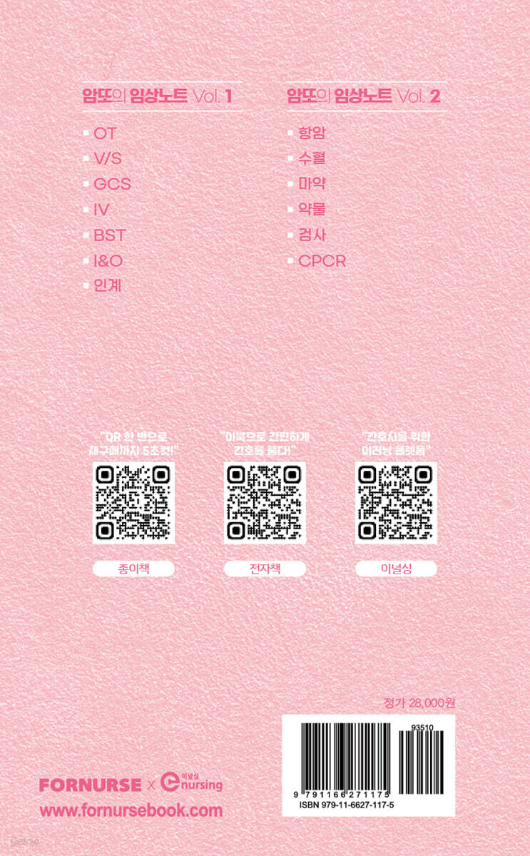 ‘하아’ 한숨 쉬고 있지 말자!(항암편) 1-01 ‘Chemo Master’ - 용어 & 항암 화학요법 1-02 ‘Chemo Regimen’ - BSA & 항암관련 물품 & Tip Plus+ ‘Leukemia Care’ - ANC & G-CSF 주사 Plus+ ‘주요 Chemo 관련 약물’ - 항구토제 & 식욕 촉진제 1-03 ‘기타 Chemo 관련 질문’ - 종양 표지자 CHAPTER 02 ‘수혈’ 에러 친 신규간호사 ‘주여’ 하며 좌절하지 말자!(수혈편) 2-01 ‘수혈 전’ - Lab & 동의서 Plus+ ‘수혈 관련 지식1’ - 수혈 종류 & 수혈 관련 물품 2-02 ‘수혈 중’ - 전처치 약물 & 수혈 Tip Plus+ ‘수혈 관련 지식2’ - 부작용 & 폐기방법 2-03 ‘수혈 후’ - 기록 & 확인 사항 . CHAPTER 03 ‘마약’ 에러 친 신규간호사 ‘마-악’ 자책하고 있지 말자!(마약편) 3-01 ‘마약 Master’ - 마약 반환 & 잔량 3-02 ‘주요 마약 관련 약물’ - 마약성 진통제 Plus+ ‘주요 진통제’ - 비마약성 진통제 Plus+ ‘주요 진통제’ - 진통보조제 3-03 ‘기타 마약 관련 질문’ - 마약과 향정 CHAPTER 04 ‘약물’이 많아 슬픈 신규간호사 ‘눈물’ 쏟기 전에 미리 공부하자!(약물편) 4-01 ‘Anti-biotic Master’- 항생제 계열 Plus+ ‘항생제와 아나필락시스 쇼크’ - AST 4-02 ‘Main Fluid Master’ - 수액 종류 & 적응증 Plus+ ‘자주 사용하는 영양제’ - 아미노산 & 지질 & TPN 4-03 ‘기타 자주 사용하는 약물’ - 종류와 적응증 CHAPTER 05 ‘검사’ 보내는 신규간호사 ‘겸사 겸사’ 미리 공부하자!(검사편) 5-01 ‘혈액검사 Master’ - 참고치 & 의심 질환 Plus+ ‘Blood Gas 검사’ - ABGA & VBGA 그리고 BIPAP 5-02 ‘자주 시행하는 영상검사’ - X-ray & CT & MRI & SONO Plus+ ‘기타 주요 검사 및 시술’ - 종류와 주의사항 CHAPTER 06 ‘Emergency’야 신규간호사 ‘이게 뭐지’하고 있으면 안돼!(CPCR편) 6-01 ‘Emergency Cart’ - 응급약물 & 응급기구 & 응급간호 6-02 ‘CPCR Master’ - 순서 & 방법 & 기록 Plus+ ‘Intubation Master’- 종류 & 방법 & Tip 6-03 ‘전동 Master’ - ICU & 타병동 & 호스피스 6-04 ‘Expire 대처 Master’ - 사망정리 & 간호 처방 Plus+ ‘퇴원정리 Master’ - 퇴원 & 가정간호 & 전원 |