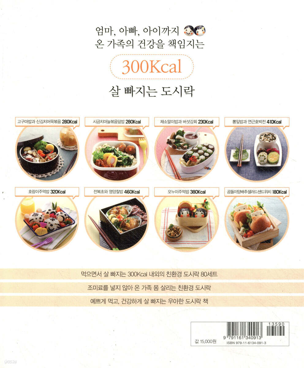 《당근정말시러의 300Kcal 살 빠지는 도시락》은 집에서 쉽게 만들 수 있는 300Kcal 내외의 친환경 도시락 만드는 방법을 친절하게 소개한다. 무려 80세트나 되는 살 빠지는 도시락은 첨가물이 없는 친환경 재료를 사용해 탄수화물, 지방, 단백질, 비티민 등 영양은 풍부하면서, 칼로리는 낮추어 맛과 영양, 건강을 모두 잡았다. 살 빠지는 도시락으로 짠 음식과 합성 조미료에 길들여진 식탁을 저염식 웰빙 식단으로 바꿔보자. 보기에도 좋고, 몸에도 좋은 300Kcal 살 빠지는 도시락으로 행복한 다이어트를 시작해보자. 1. 엄마, 아빠, 아이 온 가족이 먹을 수 있는 300Kcal 살 빠지는 도시락 엄마, 아빠, 아이 누가 먹어도 좋은 300~400Kcal 내외의 체중 조절에 도움이 되는 친환경 도시락 80세트의 만드는 방법을 쉽고 친절하게 소개한다. 단호박영양밥, 취나물밥, 다시마톱밥, 두부, 채소류와 과일, 샐러드, 해초류와 같이 칼로리는 낮으면서도 필수아미노산, 식이섬유, 비타민, 무기질, 불포화 지방산 등 필수영양소가 골고루 섭취할 수 있는 다양한 레시피를 만날 수 있다. 체중 조절과 체질 개선을 위한 도시락, 그녀의 건강을 챙겨주는 다이어트 도시락, 그의 뱃살 빼는 다이어트 도시락, 우리 남편 기 살리는 도시락, 추억의 옛날 도시락, 편식이 심한 아이들을 위한 도시락, 신나고 재미있게 예쁘고 맛있는 도시락, 아이들이 잘 먹는 샌드위치 등 알차고 건강한 다양한 도시락 메뉴를 제공한다. 2. 화학조미료를 사용하지 않아 온 가족 몸 살리는 친환경 도시락 짜지 않은 찌개용 맛된장, 구기자 맛간장, 단맛 나는 건강한 볶음 소금을 물론이고, 음식 맛을 제대로 내는 육수까지 당근정말시러만의 친환경 조미료 만들기는 어렵지 않다. 웰빙 도시락, 건강 밥상을 위한 당근정말시러만의 친환경, 저염식 조미료 만드는 노하우를 공개한다. 3. 연예인 서포터즈가 선택한 예쁘고 행복한 도시락 캐릭터 도시락을 예쁘게 잘 만드는 당근정말시러는 도시락에 그녀의 장점을 잘 살려 몸에 좋은 도시락을 예쁜 도시락으로 놀랍게 변신시킨다. 편식이 심한 아이들도 당근정말시러의 도시락을 만난 후에는 싫어했던 편식 습관이 조금씩 개선된다고 한다. 아이 뿐 아니라 어른들도 당근정말시러의 캐릭터 도시락을 보면 샘솟는 엔돌핀 때문에 다이어트 의지가 더 높여질 것이다. 보기에도 좋고, 몸에도 좋은 300Kcal 살 빠지는 도시락으로 행복한 다이어트를 시작해보자. 4. 알찬 도시락 반찬 만드는 방법까지 가득 이 책에는 20여 가지가 넘는 도시락 밑반찬 만드는 방법도 소개하고 있다. 도시락에 함께 싸갈 밑반찬 걱정을 이제 그만 날려버리고 다이어트 도시락을 빛내주는 알찬 도시락 반찬도 만들어보자. 당근정말시러의 300Kcal 살 빠지는 도시락! 이분들은 꼭 보세요. - 아이를 낳고 몸이 출산 전 상태를 회복하지 못한 몸 때문에 걱정하는 엄마들! - 비만으로 인해 체중 조절이 필요한 분(가족의 다이어트에 더 좋아요)과 다이어트 후 요요 현상을 고민하는 분들 - 날로 늘어가는 걱정스런 뱃살을 키우는 우리 시대의 아빠들 - 편식이 심해 야채를 잘 먹지 않고, 영양 결핍이 걱정되는 아이들 때문에 걱정인 엄마! - 밖에서 늘 사 먹다보니 조미료에 길들어진 오피스레이디와 직장인들! - 짠 음식에 길들여진 식탁을 저염식 식단으로 바꾸고 싶은 분들 - 굶거나 소식으로 체중 조절을 하다가 실패한 이 땅의 만성 염중성 질환(비만) 환자들 - 화학조미료나 MSG 없는 친환경 조미료 만드는 방법이 궁금한 분! - 밑반찬 때문에 도시락 싸는 것을 겁냈던 분들 - 보기 좋고 먹기 좋은 예쁜 도시락 싸는 방법이 궁금한 분 |
