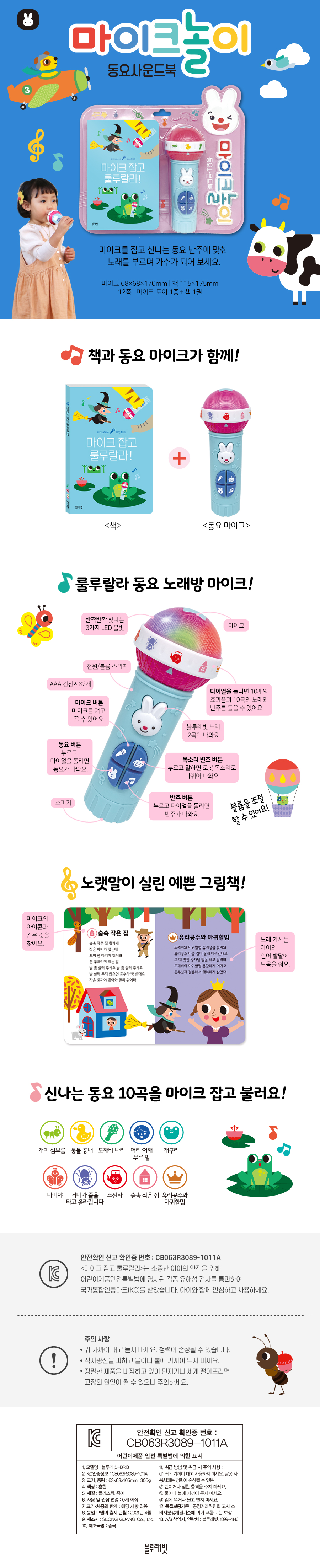 동요마이크의 손잡이에는 마이크 버튼, 목소리 변조 기능 버튼, 동요 버튼, 반주 버튼이 있어요. 그리고 전원을 켜고 끌 수 있고, 볼륨을 조절할 수 있는 버튼이 있어요. 전원을 켜면 마이크에서 세 가지 불빛이 반짝반짝 빛나요. 그리고 마이크에는 에코 효과가 있어 마치 노래방에서 노래를 부르는 것같은 기분이 나지요. 목소리 변조 버튼을 누르면 내 목소리가 로봇의 목소리로 변하여 나와 더 즐겁게 노래할 수 있답니다. 동그란 마이크에는 하얀 다이얼이 있어요. 하얀 다이얼을 딸깍! 돌리면 꽥꽥, 개굴개굴 등 효과음 10개를 들을 수 있어요. 마이크 버튼을 누르면 마이크가 켜져요. 동요 버튼을 누르고 하얀 다이얼을 돌리면 동요 10곡이 나와요. 반주 버튼을 누르고 하얀 다이얼을 돌리면 각각 동요 10곡의 반주가 나와요. 동요 마이크를 들고 가수처럼 신나게 불러 보세요. |