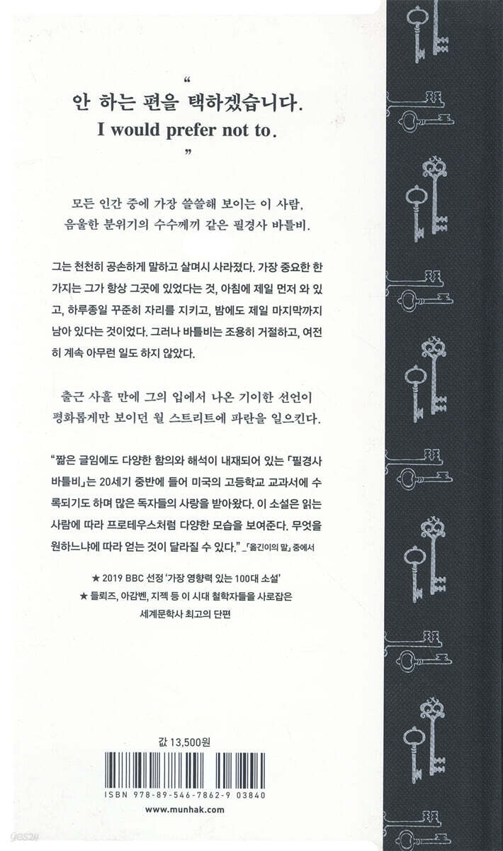 - 요컨대, 사실을 말하자면, 니퍼스는 자신이 뭘 원하는지 몰랐다. - 그렇게 포근하고 담요 같은 코트로 자신을 꼭 감싸는 것이 그에게 해로운 영향을 끼쳤음이 분명하다. 말에게 너무 많은 귀리를 먹이면 좋지 않은 이치와 마찬가지였던 것이다. 사실, 성급하고 다루기 힘든 말을 가리켜 귀리의 영향을 받았다*고 말하듯 터키도 코트의 영향을 받았다. 코트는 그를 거만하게 만들었다. 풍요가 그에게 해가 되었다. - 사람이 전례가 없고 몹시 부당한 방식의 위협을 받으면 그 자신이 지닌 가장 분명한 믿음마저 흔들리기 시작한다는 것, 이것은 별로 드문 일이 아니다. 말하자면, 그것이 제아무리 훌륭해도 모든 정의와 이성이 반대편에 있을지 모른다는 막연한 생각이 들기 시작한다. 그 결과, 그 자리에 누구든 이해관계가 없는 다른 사람들이 있으면 그들이 자신의 비틀거리는 마음을 지지해주기를 기대하게 된다. - “안 하는 편을 택하겠습니다.” “안 하겠다고?” “안 하는 편을 택한다고요.” 나는 비틀거리며 자리로 돌아와 앉아 깊은 생각에 잠겼다. 나의 맹목적인 고집이 다시 고개를 들었다. 이 깡마르고 무일푼인 인간, 내게 고용된 이 사원에게서 수치스럽게 거부당 할 수 있는 게 또 뭐가 있을까? 전적으로 이치에 맞지만 그가 틀림없이 거절할 일이 또 뭐가 있을까? “바틀비!” 대답이 없었다. --- 본문 중에서 |