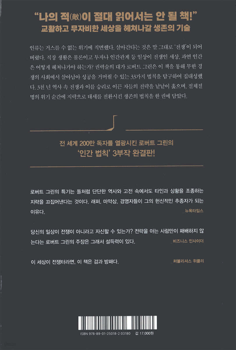 『인간 관계의 법칙』, 『인간 욕망의 법칙』에 이은 ‘인간 법칙’ 3부작 완결판 래퍼 제이지, 50센트, 카니예 웨스트와 수많은 경영자, 마약상 들을 추종자로 만든 책 “내면에 잠든 전략가를 깨워라!” 반드시 살아남아 우위를 점하게 만드는 생존의 기술! ‘부활한 마키아벨리’ 로버트 그린의 ‘인간 법칙 3부작’ 완결판 『인간 생존의 법칙』이 드디어 출간되었다. 독보적인 권력술의 대가 로버트 그린은 앞서 『인간 관계의 법칙』에서 약자들이 주도권을 쟁취하는 비결을, 『인간 욕망의 법칙』에서 권력을 향한 인간의 무한한 욕망을 이야기했다면, ‘인간 법칙’ 3부작의 완결판인 이 책을 통해 승자 독식의 치명적 위기에서 살아남아 성공할 수 있는 33가지 법칙을 탐구하여 집대성했다. 손자, 한니발 같은 고대의 전략가부터 야심만만한 전쟁 영웅 나폴레옹, 남성 중심의 세계에서 막강한 힘을 거머쥔 마거릿 대처와 러시아의 대문호 도스토옙스키에 이르기까지, 다양한 시기에 각 분야에서 활약한 위대한 인물들이 어떻게 절체절명의 위기의 순간에 지략으로 태세를 전환했는지 낱낱이 훑으며 33가지 승리의 법칙을 발굴해냈다. 질서와 상식이 통하지 않는 지금, ‘생존’은 그 무엇보다 절실한 문제이다. 로버트 그린은 소수의 강자와 수많은 약자가 생겨날 수밖에 없는 오늘날의 상황을 날카롭게 지적한다. 표면적으로는 ‘공정’과 ‘평화’, ‘질서’를 앞세우지만 사실은 직장 생활은 물론이고 투자나 인간관계 등 모든 것이 속임수와 권모술수가 넘쳐나는 전쟁에 지나지 않는다는 것이다. 그런데 매번 맞닥뜨리게 되는 갈등을 회피해버린다면, 실패의 악순환은 계속될 수밖에 없다. 어떻게 불안과 두려움을 떨쳐내고 한계를 넘어설 수 있을까? 로버트 그린은 그 해답을 위기의 순간에 역경을 딛고 일어선 위대한 인물들에게서 찾는다. 『인간 생존의 법칙』은 역사 속에서 빛나는 승리자들만이 독점하던 경험과 지식을 오늘의 관점에서 집대성한 책으로, 반드시 생존하여 우위를 점하고자 하는 미래의 야심만만한 전략가들에게 최적의 기술을 선사하는 최고의 안내서가 되어줄 것이다. 치열한 전쟁으로 치닫는 극한 경쟁의 시대, 비즈니스와 인생을 위한 승리의 기술이 필요하다! 로버트 그린은 주도권을 빼앗긴 채 무기력한 상태로 끌려다니지 않으려면, 반드시 빈틈없는 전략으로 무장해야 한다고 강조한다. 『인간 생존의 법칙』에 담긴 통찰의 결정체를 내 것으로 만든다면 어떤 장애물이 닥쳐와도 가뿐히 넘어설 수 있다. 이 책은 먼저 무한 경쟁이라는 전쟁터에 놓인 스스로의 마인드를 점검하는 ‘자기 준비의 기술’에서 출발한다. 조직을 정비하고 리더십을 향상시키는 ‘조직의 기술’과 본격적인 ‘방어의 기술’과 ‘공격의 기술’을 익히고, 마지막으로 인간 본성의 불안과 결핍을 이용하는 ‘모략의 기술’까지 전략적으로 활용할 수 있게 된다면 절대 패배할 리 없다. 교활하고 무자비한 세상에서 위인들은 어떻게 승기를 거머쥐었는가. 발 빠른 조직으로 기동성을 확보한 나폴레옹과 칭기즈칸 같은 전쟁 영웅들을 통해 ‘측면 공격’과 ‘반격의 기술’을, 최적의 순간을 기다리며 전략적인 후퇴를 감행했던 마오쩌둥과 같은 인물을 통해 ‘약자의 대응법’을 탐색해볼 수 있다. 한발 더 나아가 연약한 외모로 복종하는 척하며 적을 무력화한 간디와 예측 불허의 인디언 윈디고칸 등을 통해 ‘능수능란한 권모술수’까지 익힌다면, 이제 어떤 전쟁에서도 살아남을 수 있는 만반의 준비를 갖춘 셈이다. 오늘날 비즈니스와 일상생활의 매 순간마다 로버트 그린이 역사를 통해 증명해낸 생존의 기술 적용해보자. 무자비하고 교활한 세상으로부터 자신을 지켜내고 승리를 이끌어낼 수 있을 것이다. ‘평화’와 ‘협동’으로는 무자비한 사회를 헤쳐나갈 수 없다 선한 감정에 기대지 말고 뼛속까지 리얼리스트가 돼라! 로버트 그린이 보기에 지금 당장 버려야 할 것이 있다면, 바로 ‘평화’와 ‘협동’이라는 낭만적인 이상으로 무자비한 세상을 헤쳐나갈 수 있다는 자신감이다. 그는 개개인이 국가나 대가족, 회사 등 집단의 보호를 받을 수 있었던 과거와 확연히 달라진 오늘날에는 무엇보다도 자신의 이익을 먼저 생각해야 한다고 강조한다. 또한 인간은 원래 이기적이라는 명백한 사실을 받아들이고, 어떻게 인간 본성을 이용할 것인지 고민하는 것에서부터 변화가 시작된다고 주장한다. 그는 “사실과 거짓을 섞은 정보를 유출하라”(법칙 23), “타인의 이익을 위해 노력하는 것처럼 보여라”(법칙 27), “야금야금 갉아먹어라”(법칙 29) 등 도덕과는 거리가 멀어 보이는 조언도 서슴지 않는다. 도덕적인 패배자로 남기보다 살아남아 승리하기를 꿈꾼다면 그가 말하는 승리의 법칙에 주목해야 할 때다. 로버트 그린은 가치나 신의 따위가 인간관계를 지속하는 힘이 될 수 없다는 것이 불편하게 느껴지더라도 어쩔 수 없다고 말한다. 그가 보기에 가장 경계해야 하는 태도는 의리나 우정 같은 ‘선한 감정’에 얽매여 관계를 맺는 것이다. 상호간의 이해를 따지고 “뼛속까지 현실적”으