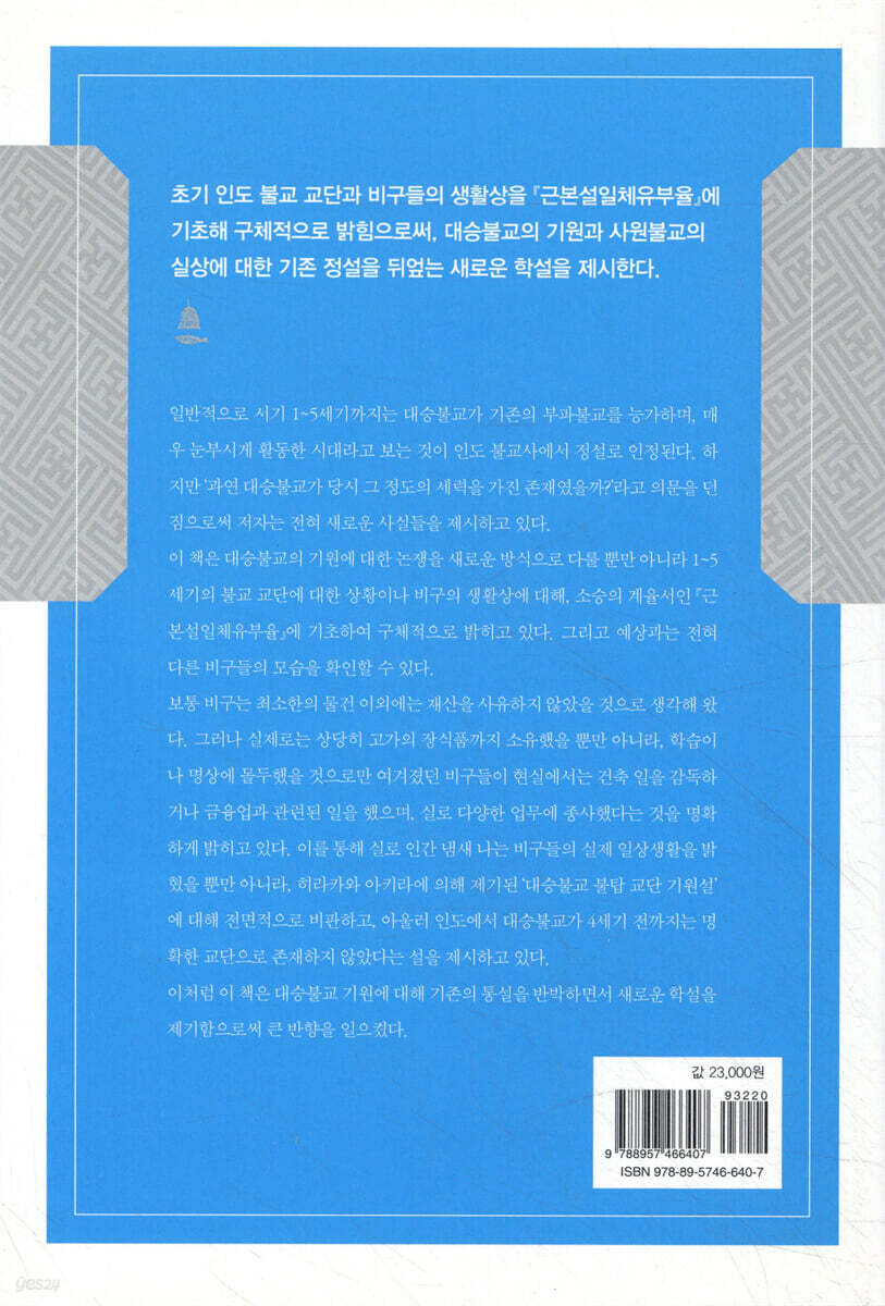 인도에서 초기 불교교단과 비구들의 생활실태를 『근본설일체유부율』에 기초해 구체적으로 밝힘으로써 대승불교의 기원과 발전, 사원 생활의 실상에 대해 기존의 통설을 뒤엎는 새로운 학설을 제시한 역작이다! 철저히 자료에 기초한, 새로운 문제의식과 주장이 흥미롭고 신선하다.