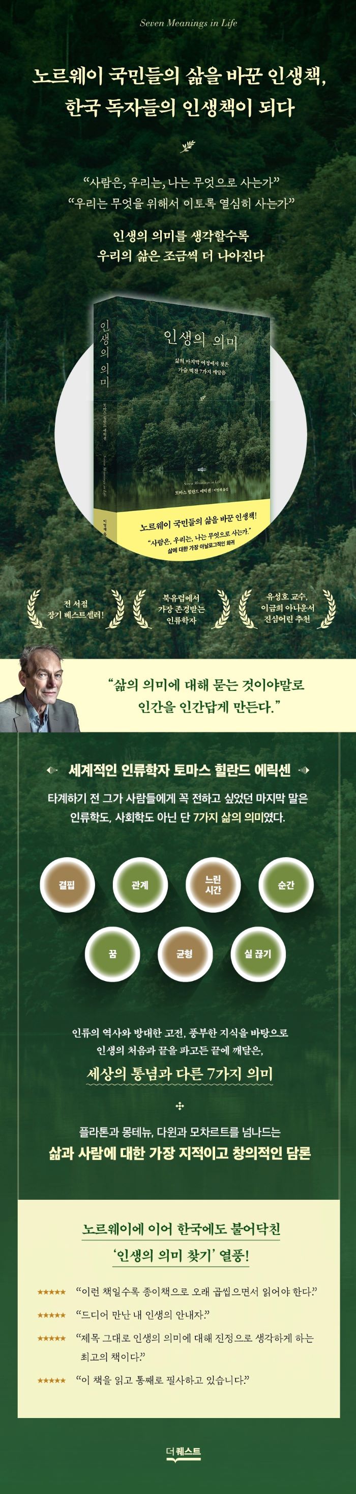 노르웨이 국민 인생책. 저자인 토마스 힐란드 에릭센는 세계적인 인류학자다. 췌장암 선고를 받고 30년 넘게 다양한 문화를 연구하며 탐색해온 인생의 의미에 관해 결론을 내기로 한다. 이 책이 바로 결과물이다. 시공을 초월해 삶을 충만하게 할 7가지 가치를 소개한다.